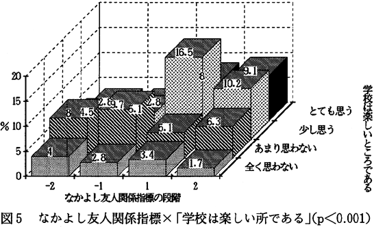 図5を見てみると「学校は楽しい所である」と質問に肯定的に答えている子どもたちで、なかよし友人関係指標のプラス段階の子どもと、マイナス段階の子どもを比べた場合、プラス段階の子どもたちの方が、「学校は楽しい所である」と考えている割合が多いことがはっきり分かる。反対に「学校は楽しい所である」という回答群に、否定的に答えている子どもたちの中で、なかよし友人関係指標のプラス段階の子どもと、マイナス段階の子どもを比べた場合、マイナス段階の子どもたちの方がプラス段階の子どもたちより割合が多いことが確認できる。このことから、子どもたちにとって「学校は楽しい所である」ということと、なかよし友人関係を持つということの間には、関係があると言えよう。