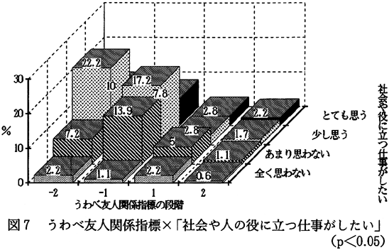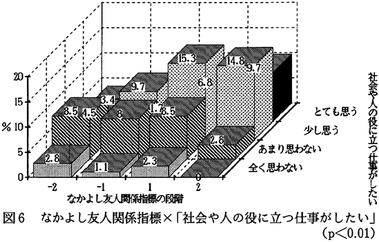 「あなた自身」と友人関係指標との間で有意差がみられたものは、4項目ある。「あなたは社会や人生について、どのように考えますか」の質問に対する回答の中で、「社会や人の役に立つ仕事がしたい」について、なかよし友人関係指標とうわべ友人関係指標との間において有意差があった。 図6を見ると、「社会や人の役に立つ仕事がしたい」に肯定的に答えている子どもたちの中では、なかよし友人関係指標のプラス段階の子どもと、マイナス段階の子どもを比べた場合、プラス段階の子どもたちの方が46.6%とマイナス段階の子どもたちより人数の割合が高い。一方、「社会や人の役に立つ仕事がしたい」に否定的に答えている子どもたちの場合、なかよし友人関係指標のプラス段階の子どもと、マイナス段階の子どもを比べた場合、マイナス段階の子どもたちの方がプラス段階の子どもたちより人数の割合が多いことが確認できる。このことから、なかよし友人関係と「社会や人の役に立つ仕事がしたい」との間に関係があると言えそうである。