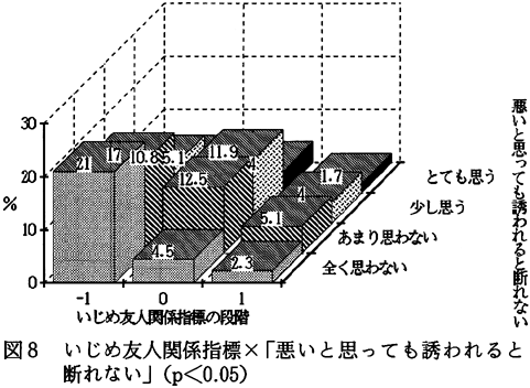 次にいじめ友人関係指標と「悪いと思っても誘われると断れない」との間で有意差(p<0.05)があった。図8を見ると、「悪いと思っても誘われると断れない」に対して否定的に答えている子どもたちの場合、いじめ友人関係指標のマイナス段階の子どもたち(このような友人関係を持っていない)は、全体の55%とプラス段階の子どもたち7.4%をはるかに上回っている。しかし、「悪いと思っても誘われると断れない」に対して肯定的に答えている子どもたちの中にも、いじめ友人関係指標のマイナス段階の子どもたち(このような友人関係を持っていない)が、31.8%もいるということがわかる。 これは、いじめ友人関係を持っていなくても、まわりから誘われると悪いとわかっていても断れないところが、子どもたちの中にはあるということを意味する。