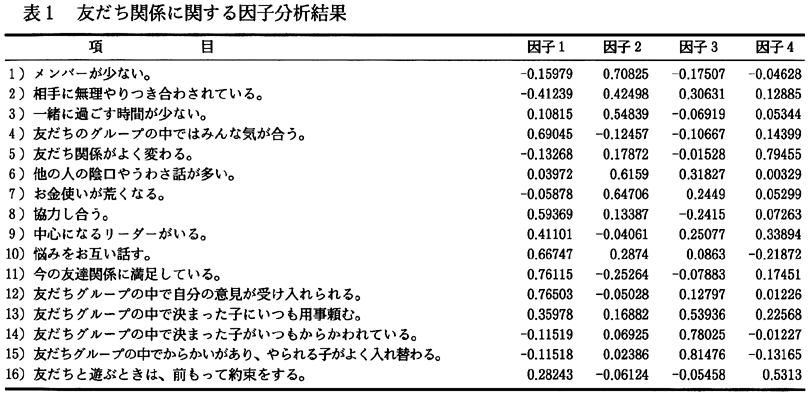 3.調査の結果 1) 友人関係の指標化 今回の調査では、子どもたちが友だち関係をどのように捉えているかに視点を置いている。そこで、子どもたちが自分たちの友だちグループをどのように見ているかを、つぎのような16項目に対して四者択一(1 とてもそう思う、2 少しそう思う、3 あまり思わない、4 まったく思わない)で答えてもらった。 1)メンバーが少ない。 2)相手に無理やりつき合わされている。 3)一緒に過ごす時間が少ない。 4)友だちグループの中ではみんな気が合う。 5)友だち関係がよく変わる。 6)他の人の陰口やうわさ話が多い。 7)お金使いが荒くなる。 8)協力し合う。 9)中心になるリーダーがいる。 10)悩みをお互い話す。 11)今の友だち関係に満足している。 12)友だちグループの中で自分の意見が受け入れられる。 13)友だちグループの中で決まった子にいつも用事を頼む。 14)友だちグループの中で決まった子がいつもからかわれている。 15)友だちグループの中でからかいがあり、やられる子がよく入れ替わる。 16)友だちと遊ぶときは、前もって約束をする。 この1)〜16)を因子分析にかけた結果、表1に示すように4因子が抽出された。