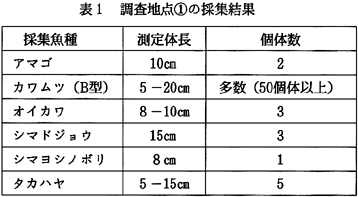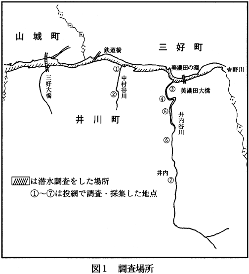 2.調査の結果 吉野川に生息する淡水魚は自然生息のものが多い。調査場所は、吉野川本流では、井川町区域のすべての場所を潜水調査し、肉眼で生息する魚種を確認して水中ノートに記録した。井内谷川では調査地点を5カ所設定し、投網で採集した。また中村谷川の2カ店で調査し、採集した。調査場所を図1に示す。
