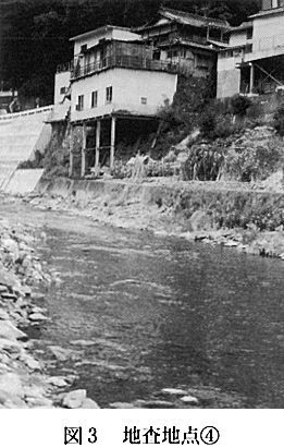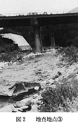 に水がたまっている。さらに上には堰(せき)があるが上方より水が流れて来ている。ここで投網を使用して採集をし、体長を測定した。アマゴの幼魚が2個体採集できたのは、特筆されるが、放流されたアマゴであろう。付近の吉野川本流にはアマゴがみられないからである。タカハヤが、幼魚も含め5個体もこのような場所で採集できたのは、驚くのみである。タカハヤは、支流でもかなり上流域で、水温の低い所に見られるのが普通である。 調査地点2