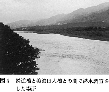 のものが中央部で、早い水流に抗して泳いでいる。大きなカマツカなども少し見られるが、個体数は少ない。川岸近くの、流れがゆるやかでレキ底の場所では、シマドジョウが生息している。以上鉄道橋〜井内谷川口付近で確認した魚種は、ウグイ、オイカワ(雄、雌)、カマツカ、アユ、ニゴイ、シマヨシノボリ、シマドジョウの7種であるが、大形のものが多い。 (3)美濃田大橋付近 美濃田大橋付近は大きな淵になっていて、水深7m