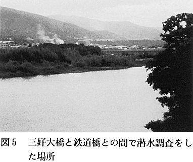 あり、大型のものも多い。コイも生息していて、ニシキゴイも少し見られる。以上三好大橋から鉄道橋付近までに生息を確認した魚種は、オオクチバス、ナマズ、ギギ、ニゴイ、ハス、ギンブナ、ウグイ、ドンコ、シマヨシノボリ、カワムツ、シマドジョウ、コイ、ニシキゴイ、オイカワの15種である。 (2)鉄道橋〜井内谷川口付近 ここは浅瀬が多く、直径30cm