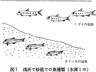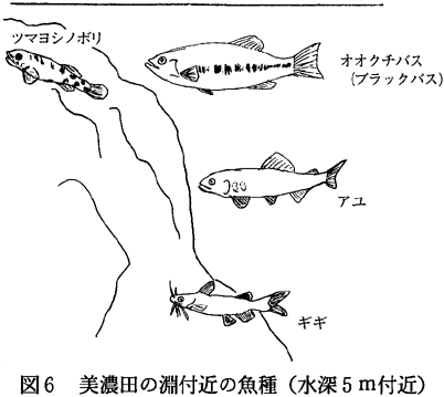 程のシマヨシノボリが2〜3匹、岩盤の表面にみられた(図6)。以上生息する魚種は、オオクチバス、アユ、ヨシノボリ、ギギである。川岸近くの浅い場所では、ツルヨシやヤナギの木の根が水中にはっており、川底は砂や泥になっている。水の流れはほとんどなく、おだやかである。こうした場所では、体長の小さい幼魚が群れになって生息している。幼魚から成魚に成長する大事な場所である。砂底の所では、体長3〜5cm