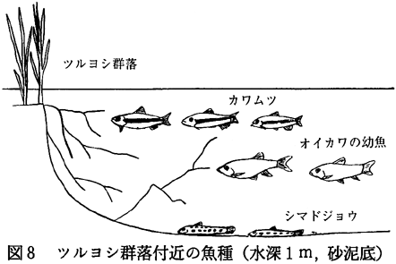 の幼魚から成魚までが同じ場所でみられる。ツルヨシやヤナギの根が水中に多く出ている場所は、カワムツやオイカワの幼魚やシマドジョウなどが育つ大切な場所である。コンクリートで護岸を固めると、幼魚が育つことができないので、幼魚が育つための、植物の生育に配慮した護岸づくりが必要である。