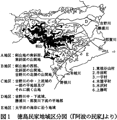 1.はじめに 徳島での先駆的な民家調査に『阿波の民家―徳島県民家緊急調査研究報告―』(昭和51年)がある。ここでも述べられているように、民家は祖先がたゆみない努力を続けて築き上げた貴重な文化遺産であり、このような民家の資料を将来に残し伝えることは現在の我々の責務である。そのための民家実態調査であり、まず基礎資料づくりが必要である。徳島県は近世民家の宝庫といわれる。『阿波の民家』では徳島県の民家を大きく5地区に地域区分しているが(図1)、大筋では山間部の民家、平野部の民家、浜の民家に区分される。井川町は未調査であるが、位置的にはBとC地区の境にある。このような井川町のなかにどのような民家があり、どのような特徴があるのかを明らかにするのが本調査の目的である。最終的には徳島県全体の民家特性を明らかにすることが目標で、1年に1市町村というスローペースながらも、将来の分析の礎となるデータを積み重ねていきたい。 調査対象民家は出来るかぎり偏りなく井川町全域から抽出するとの方針で、7月25日(金)結団式のあと予備調査をおこない、その後3日間の実測調査と1日の補足調査を行った。民家班調査員は、日本建築学会員を中心に上記執筆者のほか、林建築事務所の阿部純子、東久美子が参加し、調査や作図を行った。また全国の社寺建築や民家を実測調査されている妻木靖延氏が8月10日に特別に参加している。(酒巻)