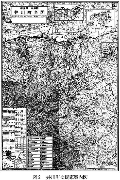 4.まとめ 井川町は徳島県の西側にあり、県を東西に縦断する吉野川の南岸に位置する。吉野川に沿った平地以外はほとんど山地であるため、山の斜面にへばりつくように民家が建てられるという、徳島県の山間地域特有の散居的集落景観が展開されている。川は度々氾濫(はんらん)するうえに、日当たりの悪い谷筋より、水さえ確保できれば日の当たる中腹斜面の方が居住に適していることもあって、このような集落景観が形成されてきたものと思われる。調査した民家の多くで見られた「土桶」がそのことを示している。 井川町での調査対象を「山の民家」と「まちの民家」の二つに大別して考えたが、調査対象の11棟のうち「まちの民家」は2棟で、残りの9棟は散居的集落にある。井川町はかつてタバコで栄えたまちで、ウダツの上がった六つの商家と贅(ぜい)を尽くした材料を使った二つの「まちの民家」は、山の民家とともに繁栄した当時をしのばせる構えをもっている。 主屋は地元の人が「六8畳」と呼ぶ、オモテ、オク、ナカノマ、ナカオクなど田の字の4部屋に2間分の土間を加えた間取りの民家が多くみられた。『阿波の民家』でも分類され、徳島県下で普通に見られる「四間取り」であるが、傾斜地という建築が困難な敷地条件からみると比較的に規模が大きいといえ、「六8畳」という呼び名が表れてきたのであろう。またそれぞれの「山の民家」は等高線に沿った細長い屋敷に、主屋、タバコ乾燥小屋や蔵などを配置している。これらも、タバコ産業で潤った時期を証するものである。 主屋の入口では、3棟の「左勝手」があった。井川町のすべての民家を調査した結果ではないが、吉野川流域北・西部は「左勝手」が多いというこれまでいわれてきた傾向とは少し異なる。元草葺き屋根の山の民家は、1〜2棟の例外を除いてほとんど青色のトタンで覆われている。また棟札が発見された民家はなく、いずれも建築年代が特定できていない。山の民家は専用のタバコ乾燥小屋を敷地内に建てるか、主屋の屋根裏でタバコを乾燥させていた。現在、多くの民家では天井が張られ、小屋組みは見上げられない。調査した11棟のうち2棟は、天井板を固定せずに置いただけの「オキ天井」であった。材料としては、土壁の上をヒシギ竹で覆ったり、半割竹を敷き詰めたスノコなど、地場で採れる竹を使ったものがみられた。 井川町の民家は、徳島県の一般的な様式を踏まえながらも、その地形的・地理的な特徴やタバコ産業が発達した歴史的な経緯から、独自の地域的特色を併せ持っている。そして、飲み水を更に高い谷から引いてくる技術の発達で、中腹斜面に建つ「山の民家」が成立し、生業としてタバコを作る。川の近くにある「まちの民家」は山で作られたタバコを集め、消費地で財に換えて「山の民家」に還元する。そのような、タバコを媒体とした「山」と「まち」の交流や、タバコ産業によって有機的にネットワークされた豊かな地域社会の存在を、思いおこすことができる。 (田村)