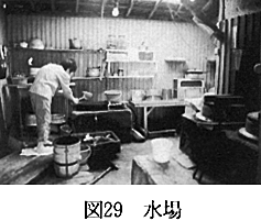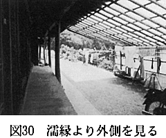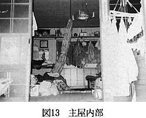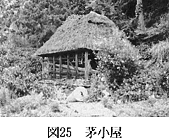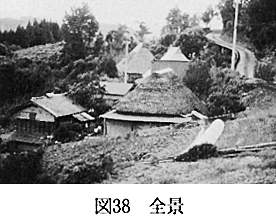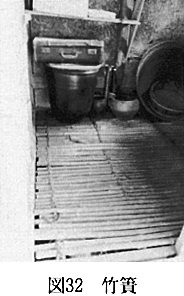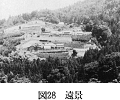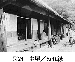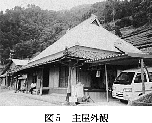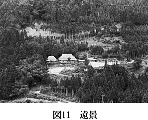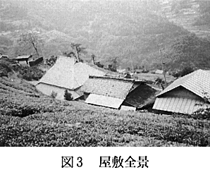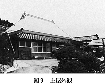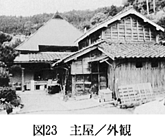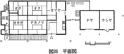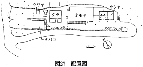 (6)上笹 鉄男 家 里川129番地 杉林の中の細い坂道を延々登ると、急に視界が開け、里川東の集落が現れる。当家は、日当たりの良い南西向きの急傾斜地に青石を積み上げ、段状に切りならした細長い敷地にある(図28)。手前から奥へ牛屋・納屋、主屋、蔵、突当たりにタバコ乾燥小屋、カギの手に折れて、便所・風呂、最奥に上屋が建つ(図27)。見晴らしが良く、深い谷を挟んで里川本村、里川西の集落が見渡せる。屋号は「ヒウラ」。以前はタバコと林業に携わっていたが、現在は茶の栽培をしている。 主屋は「後ネマ四間取り」の平面構成で、屋根は草葺きであったものを、1970年ごろスレート瓦に葺替えている。牛屋・納屋と主屋の間には屋根がかけられ、かつて戸外にあった土桶が屋内に取込まれ(図29)、主屋のニワの一部を改造した台所と引戸ひとつでつながっている(図26)。また、主屋の前庭には濡縁の庇(ひさし)を伸ばして、物干し場などに使われている(図30)。蔵の入口右手には、床を竹簀(たけす)としたみそ・しょうゆ庫がある(図32)。タバコ乾燥小屋は、主屋の地盤から半割丸太を並べた桟橋越しに直接2階におよぶ乾燥室、1階は裏手の階段を降りた一段低い畑のための納屋と、敷地の高低差を生かした構成となっている(図31)。 (植村)