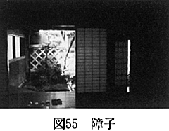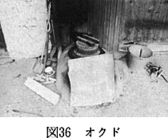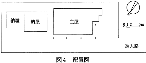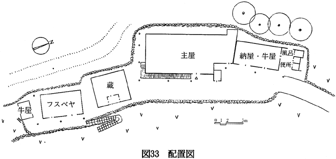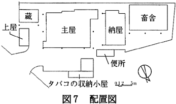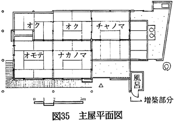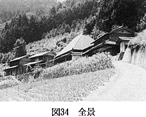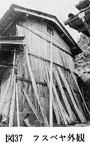 (7)宮本 進 家 里川449番地 急な斜面の中で比較的平坦(たん)な場所に石垣が積まれ、等高線に沿った細長い敷地に便所、納屋・牛小屋、主屋、蔵、フスベヤ(タバコ乾燥小屋)、牛小屋が並んで配置されている(図33)。屋敷の前面は畑、裏は杉林に囲まれている(図34)。屋号は「ヒウラ」、家紋は「桐(きり)」。家人によると、それぞれの建築年は、主屋1850年ごろ、納屋・牛小屋は1920年ごろ、フスベヤ1941年、蔵1956年である。主屋は「四間取り」で、現在台所として使っている部分を増築し、もともと土間であった部分を改築してチャノマとして使っている(図35)。大黒柱は松、それ以外の柱は栗である。ドマのオクドと外部のオクド(図36)は現在でも使われているので、主屋南の軒先に薪(たきぎ)が整然と積まれている。 フスベヤの妻側外壁は、土壁大壁の上をひしぎ竹で覆っている。これをニノカベ(蓑壁(みのかべ))と呼び、井川町山間部の古い納屋や乾燥小屋によく見られるものである(図37)。 (根岸)