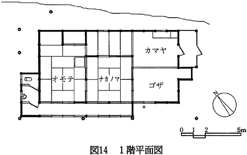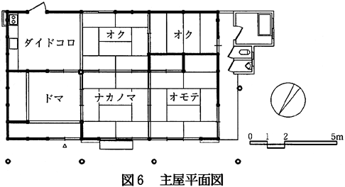 3.井川町の民家 1)山の民家 (1)藤丸 恒夫 家 井内東5679番地 藤丸家はもともと農家であり、1970年代までタバコをつくっていた。当時は屋根裏に葉タバコを釣って、部屋の掘ごたつの暖気により乾燥させていた。かつては、麦を生産していたため、麦ワラで屋根を葺(ふ)いていたが、1960年代初めごろに現在のトタン巻きにしている。屋号は「カジヤ」といい、家人によると、昔は鍛冶(かじ)屋をしていたのかもしれないということであった。屋敷は山の北斜面中腹に位置し、建物自体も北向きとなっている。接道は北側にあって、屋敷の西側からの進入となり、進入側から主屋、納屋2棟が直線的に配置されている(図3、4)。 主屋はワラ葺(ぶ)きで、本来は三方瓦(かわら)葺きの下屋付きであったが、裏側(南)にもトタンで下屋が増設されている(図5)。建築年は明確でないが、聞き取りによると1850年ごろだという。平面は田の字型「四間取り」で、正面から向かって左側に「ドマ」とその奥に「ダイドコロ」、右手前に「ナカノマ」「オモテ」、奥に「オク」が2間となっている(図6)。出入り口が正面の左側にある「左勝手」で、井川町では例が少ない。 (速水)