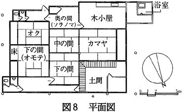 (2)阿佐 信孝 家 井内東3999番地大久保 町内きっての古い民家として知られる当家は、永禄年間(1558〜70)に祖谷より出てきた平家の末孫阿佐家の分家で、庄屋を補佐する阿佐五人組の筆頭をつとめた。屋号の「オモテ」は、部落の中心に家があったことに由来している。家紋は「丸にアゲハ」、氏神は馬岡の新田神社で、阿佐一党の墓は若宮神社にある。 屋敷の構えは大きく、東から上屋、蔵、主屋、葉タバコの収納小屋、納屋、畜舎などが線上に配置されており、主屋玄関は北北東を向いている(図7)。主屋は1980年ごろ屋根にトタンを巻いた際、合わせて内外に改造が加えられている。当主によるとその際に1680年ごろの棟札(むねふだ)を確認しているという。外観は改造されている割には、風格を持った大農家の面影をよく残している(図9、10)。 間取りは変形の「四間取り」であったと思われるが、この地域に多い「六8畳(むはちじょう)」とは異なる部分も多く、「六8畳」成立前の間取りの痕跡を残している可能性がある。「六8畳」は各8畳の「四間取り」の構成が基準になるが、当家の場合は大黒柱の位置、柱通りの不規則性、カマヤと呼ばれるカマドを備えたイロリ部屋があったらしい事など、「六8畳」を改造して現在の姿になったとは考えにくい(図8)。ただここでは、調査件数の問題や歴史的資料の不足もあり、その可能性を指摘しておくにとどめたい。 内部はかつてオモテだけに天井があり、その他の部屋で葉タバコを屋根裏に釣って乾燥させていたという。現在は、改造で天井や壁などが新建材で覆われている。天井裏をのぞいたところ、小屋組はカンダミという組み方で、チョウナ削りの栗(くり)材の梁(はり)が使われている事が確認できた。残念ながら柱も大部分が新建材に覆われており、ニガキ(キハダ)の大黒柱と他に1本が顕(あらわ)しになっているのみである。 (本田)
