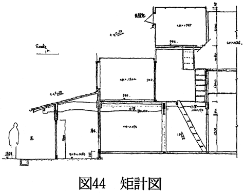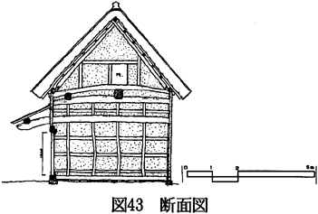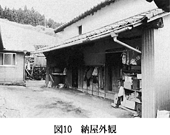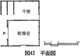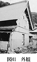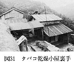 (9)藤井 秀治 家(タバコ小屋) 井内東4401番地 草葺きのタバコ乾燥小屋が残っている例は県下でも珍しい。建築年は1915年ごろ。家人によれば、小麦を作っていたのでそのワラで葺いたらしい。現在、屋根と外壁はトタンで覆われている(図41)。牛小屋を兼ね、その上部にも床があり乾燥室として使っていた(図42、43)。主屋は草葺きをトタンで巻いてあり、比較的大きな風格のある民家であるが、今回は乾燥小屋のみの調査となった。 (根岸)
