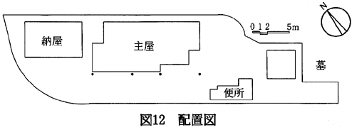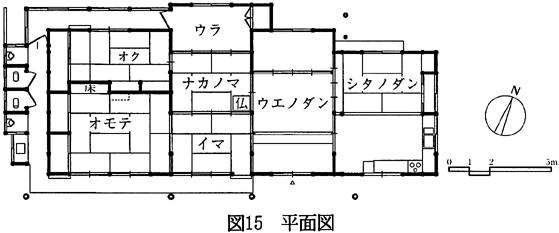 (3)北本キミエ 家 井内東1567番地 岩坂の集落と谷を挟んで対面する山の斜面に、一戸だけぽつんと離れて建っている(図11)。祖先は新田義貞の弟義治(よしはる)の系といわれる。文化13年(1816)の石塔を含む墓が敷地の東側にある(図12)。明治20年(1887)ごろに村会議員をしていた北本定蔵がいるが、それ以前は百姓であったという。屋号は「イデグチ」、家紋は「タチバナ」である。 井川町教育委員会発行「平成3年度版井川町の文化財」に地福寺住職宮内氏が当家を調査しており、その一部を引用する。「文化年間(1804〜18)の建物と言われ、昔の一般的な農家の形式を残すもので、(中略)建物は大きく三つに分かれており、母屋も三つに分かれ、表の間は神床、仏壇を祀り、掘り炬燵(こたつ)を中心に右隅の座を上げると茶を作る焙炉(ほいろ)が作られていた。(中略)主屋の次の建物は納屋と牛屋が一緒になっており、中二階で天井は大和と呼ばれ、細い丸竹を縄で組みその上を赤土でぬり固めたもので、耐火耐寒の建物である。その他、近年建てられた蔵、乾燥屋、便所等からなっている。(略)」 主屋の間取りは、徳島の山間部に多い「中ネマ三間取り」である(図14)。「ナカノマ」の北の部屋はお産や死ニコロビに使われた部屋として増築されたようであるが、現在は物置となっている。主屋は昭和62年(1987)に改造され、濡縁(ぬれえん)にアルミサッシがつけられるなど、かなり内部に手が加えられている(図13)。 (姫野)