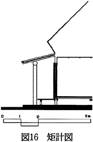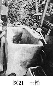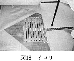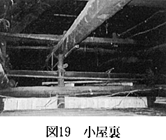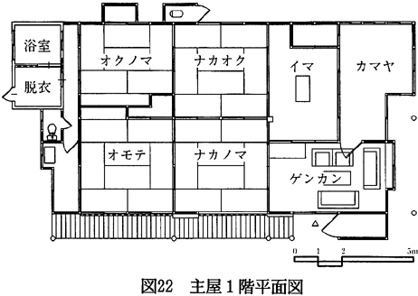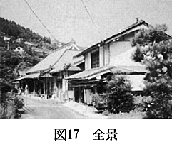 (4)阿佐 淳一郎 家 井内東547番地 阿佐家はもと平家の家来である。現当主正一郎氏は1980年ごろから国道192号沿いに住まいを移しており、今は空家になっている。50町歩程の山を所有し、以前は敷地内南のハナレに、一年中山の手入れをしたり炊事や畑仕事をする夫婦が住み込んでおり、男を「トウリョハン」、女を「ナナハン」と呼んでいた。 配置は、南側の山を背に東側からタバコ乾燥小屋、主屋、納屋が並んでいる(図17)。かつては敷地内南に、御庵(おあん)と呼ばれる部落の集会所があった。 昔は、家のどこかに常に手を入れており、いつも大工が来ていた。縁側を1940年ごろに改造している(図16)。ウエノダン(玄関・作業場)はかつては土間であった。シタノダン(台所)が1950年ごろに東側に拡張され、あわせて新しい土桶(どおけ)が作られた。土桶とは、かつて谷川から水を引いてきてためていた桶で、イズミとも言った。現在は水道に取って代わられているが、傾斜地に建つ民家を成立させた生活の道具である。 シタノダンにはオクドがあった。ウラは建築当初にはなく、後からの増築である。オクとオモテの間には両方から使っていた床があり、違い棚は作らなかった(図15)。座敷の各部屋にはイロリがあって、タバコの乾燥にも利用していた(図19)。 屋根裏は天井板を置いただけの「オキ天井」である(図18)。屋根は茅(かや)葺きであったものをワラ葺きに変え、現在はトタンで巻いている。部分的に改造はされているが、全体的には古い民家の面影をよく伝えている。 (工藤)