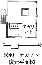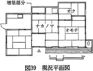 (8)大森 房雄 家 井内東4334番地 この辺りは大森という字名で、当家と藤井家(次項)が並び、少し小高いところに大森のお堂がある(図38)。草葺きをトタンで巻いた民家が多い中で、主屋は本来の草葺きのまま残り、段葺きであることがわかる。等高線沿いの細長い敷地に主屋、便所、風呂が並び、タバコ乾燥小屋は下の畑に建ち、1階を畑から、2階を乾燥室として主屋レベルから使っている。 主屋の建築年は不明であるが、座敷の柱にチョウナ仕上げの曲がった栗材を面皮付きで使っていることなどから、相当古いと考えられる。西側の部屋と台所は、1970年ごろ増築され、玄関とナカノマが現在のように改築された(図39)。以前は、板の上にムシロを敷いており、イロリとオクドがあった。西の軒先には竹簀が敷かれ、山から引いてきた水を溜めておく水瓶(みずがめ)があったそうである(図40)。ナカノマの押入部分が増築されていることやオブタの出が不自然なことから、オクも後から増築され、建築当初は「横一間取り」であった可能性がある。1990年ごろまでタバコをつくっており、天日干しの後、ナカノマの小屋裏に釣って乾燥させていた。 (根岸)