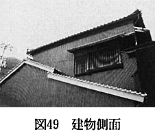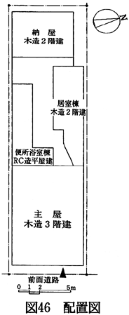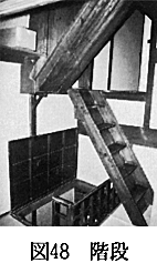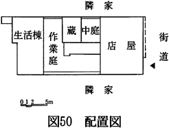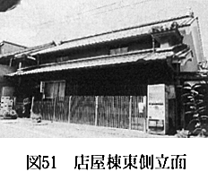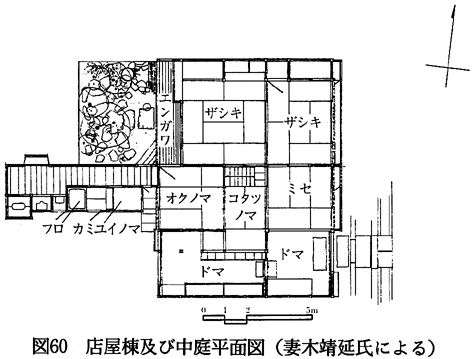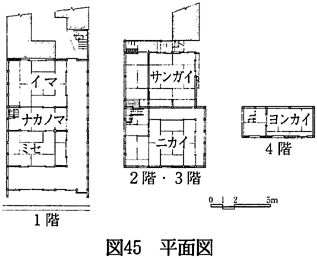 2)まちの民家 (1)熊谷 照也 家(町屋商家) 辻86番地 辻の町並みに平入りの軒を連ねて当家はある。現在は仕舞屋(しもたや)だが、かつて食品を商っていたそうで屋号は「■(ヤマヨ)」。通りから見る外観は特異で、2階屋根の上にもう一層、妻を通りに向けた入母屋(いりもや)の3階が乗っている(図47)。3階の窓は虫篭窓(むしこまど)だが、立端(たっぱ)が低いため小さい。敷地は通りの西側に位置し、町屋に典型的な短冊(たんざく)形で東西に細長い。主屋の奥には中央の細長い庭を挟んで、南にRC造平屋の便所浴室棟、北に木造二階建ての居室棟がある。さらにその奥には二階建ての納屋が建つ(図46)。 主屋は棟札により明治3年(1870)の建築。平面は間口3間半、奥行き5間半の右勝手である。出入口を入ると右の壁に沿って「通りニワ」が奥まであり、左側は土間のミセに続いて座敷が7畳半、4畳(ナカノマ)、8畳(イマ)と並んでいる(図45)。手前の7畳半は最近土間部分に新設されたもので、ナカノマとの間に7寸角の欅(けやき)の大黒柱がある。外見から3階建てに見えているが、実際には表側3層、奥側2層のスキップフロアーの4層である(図44、48)。これは、3階座敷を増築したとき、立端の低い表側まで同じ高さで軒を伸ばし、無理矢理そこに4階部を継ぎ足したことが建物横外観から判明する(図49)。このような増築方法は珍しく、狭い敷地内での空間確保のための工夫に感心させられる。座敷は、床の間の違い棚や書院(しょいん)の障子(しょうじ)や欄間(らんま)、窓格子等に意匠細工が凝らされ、増築当時の当家の繁栄ぶりがしのばれる。 (林)