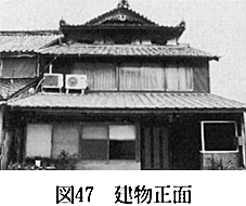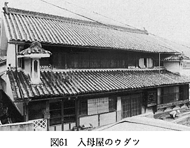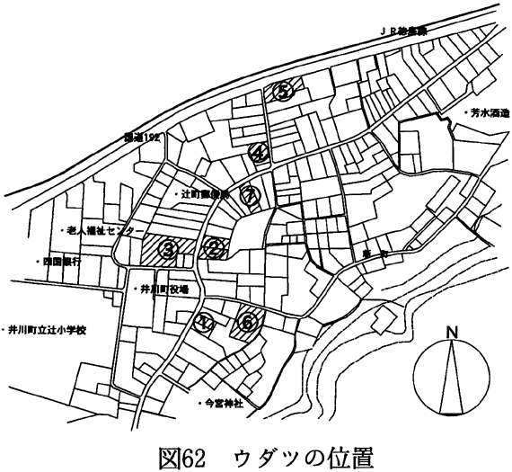 (3)うだつの民家 辻界わい 井川町はじめ吉野川流域は、江戸時代中期より葉タバコの生産地として活況を呈したが、中でも辻は、祖谷全域の葉タバコの集産地として、明治30年代に最も隆盛をきわめた。葉タバコの加工及び製品化を図り、北海道までもその販路を拡大した大きな商家も成立するに至っていた。この様な活発な商業の町としての名残りのひとつが、ウダツを上げた商家の町並みである。ウダツは本来は火災時の延焼を防ぐための壁であるが、実際には店の繁栄を誇るシンボルとしての一面もあり、むしろ後者の意味合いが大きかった。しかしそのウダツも、現在では辻界わいで6軒の商家に残るのみとなっている(図62)。 ウダツは中2階が高いほど年代が新しく、脇町からはじまりついには貞光のような二層ウダツが現れる。辻の場合は中2階の階高の比較から、脇町より新しく、貞光より古いと考えられる。その時期に、辻の町が最も栄えたのであろう。 これらウダツの屋根は、寄棟が3例、切妻が2例あるほかに、入母屋という珍しい屋根を持った例(仁尾彰文家)も認められる(図61)。またほかに、現在はないが過去にウダツを上げていたと推測される例(外壁面に痕跡がある)も確認することができた。 ただ、一部を除いて辻の民家は老朽化が進み、建て替えも徐々に進行している。ウダツを上げた商家の中にもかなり傷んできている事例もあり、何らかの対策を迫られていると 言える。すでに連続したウダツの町並みとは言えない状態になっているが、過去の繁栄の証人としてだけではなく、町民の生活文化を反映した貴重な文化財としての視点からも、保全が必要と思われる。 (本田)