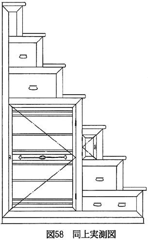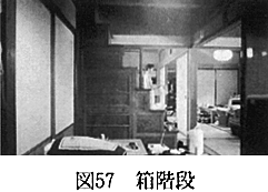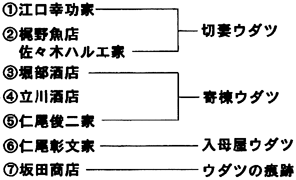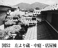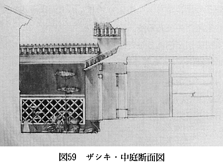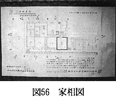 (2)立川酒店(商家) 辻159−1 屋敷周辺は、旧街道三差路を中心に商家が立ち、ウダツの家並みを形成している。この交差点から池田よりの街道西側2軒目が、立川家である。屋敷は、間口が5間半、奥行き15間の長方形である。東は道に面し、他は隣家の町屋に接し、高低差は少ない(図50)。 建物の配置は、ウダツと外壁が黒漆喰(しっくい)で仕上げられた平入り厨子(つし)造りの店屋棟(図51)、中庭を挟んで同じく黒漆喰仕上げの2階建の蔵(図52)、その奥に家事用作業庭を挟んで2階建の生活棟となっている。 敷地中央の蔵は、店屋棟と生活棟の防火壁としての役割もはたしている。また高い蔵の壁や中庭・作業庭の持つ機能的な役割により、店屋棟や生活棟に風が通り、夏でも冷房機を必要としないそうである(図59)。これも町屋が密集する地域での生活の知恵と言えよう。 店屋は左勝手で、玄関を入るとドマ(4.5畳)、ドマ右側の上框(あがりがまち)を隔てミセ(4.5畳)、コタツノマには箱階段(図57、58)があり屋根裏部屋に通じている。ミセに隣接してザシキ二間(8畳、6畳)と縁側を介して中庭がある。また、ドマを直進すれば、下屋の細長い通路が続き、便所・風呂・炊事等の作業庭、続いて生活棟に至る(図53)。 立川家は、タバコを製造販売した商家である。商いは北海道にも及び、その隆盛はザシキが如実に物語っている。ザシキの床柱は、鉄刀木(たがやさん)。柱、框、違い棚は黒檀(こくたん)(図54)。障子・襖枠(ふすま)は紫檀(したん)(図55)。舞良戸(まいらど)は、1枚板で半田産の漆塗りである。大黒柱は、7寸角の欅で四方柾(まさ)である。二段の長押(なげし)で枠木が施された蟻壁(ありかべ)の構成は、民家としては豪華なものである。伝えでは、屋大工は堅木の外材が加工できる職人を、大阪から呼んだと言う。建具や箱階段などもすぐれた職人に時間をかけて作らせたとのことで、何れも現在まで使用されているが、一分の狂いも無い立派なものである。また中庭は、高松栗林公園の庭師が、小堀遠州流により作庭したとのことである。建築主は2代目山口屋甚五郎・貞太郎で、普請に造詣(けい)が深く、十数軒目の自作の間取りである(図60)。店屋・蔵は明治36年(1903)の建築で、特定は掛け軸で保管された家相図による(図56)。この家相図は、当主の普請に対する思いがしのばれる品である。築後には、「金窮時、家を売るな。解体して、資材で売れ」と言い残している。平成3年、店屋棟の屋根は、本瓦を桟瓦に葺き替えられた。生活棟は、昭和初期の改築である。 (田處)