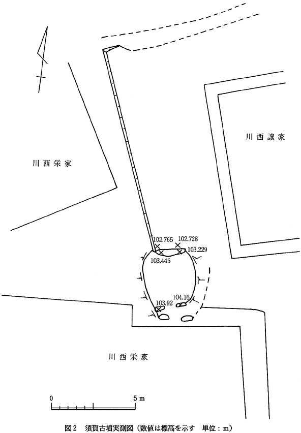 という後期古墳としては高所に立地する古墳である。また今回の調査で、川西栄氏から御教示を頂き、新たに2基の古墳の存在を確認した。1基は、須賀古墳から北東約20m