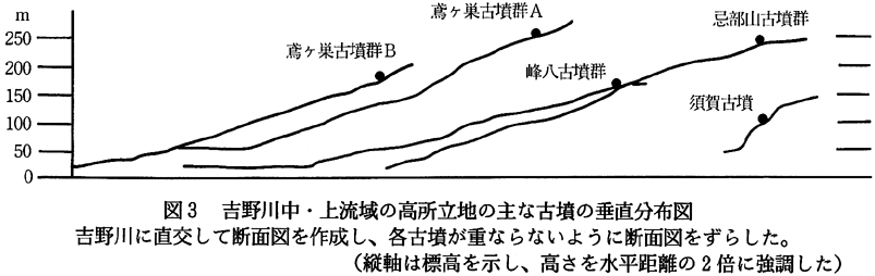 程度の中央部が膨らむ形の玄室が想定できる(図2)。羨道(せんどう)部は全く不明である。また、気がかりな点としては、玄門立石が2組立っている点である。この立石が築造当時のものとすれば、いわゆる複室構造と考えられる。もし、複室構造とすれば、鴨島町の西宮古墳に次いで、本県では2例目となる。 3)考察 今回の須賀古墳の調査成果により、従来あまり知られていなかった、三好郡内の後期古墳の特徴の一端が明らかになった。 まず須賀古墳は、胴部が膨らみ、玄門立石をもつ横穴式石室を内部構造とする後期古墳であることが判明した。いわゆる段ノ塚穴型石室注1の特徴(平面プランが長方形でなく胴膨らみで、天井石を持ち送る)をもち、複室構造の可能性もある。また、少なくとも3基がこの近辺に存在しており、群構造での分布も同じ特徴と言える。 次に、横穴式石室としてはかなり高所に築造されているという特徴がある。吉野川中・上流域の後期古墳の立地と比較してみる。第一グループに、忌部山型石室の忌部山古墳(山川町)や鳶ヶ巣古墳群A(川島町)の標高250m
