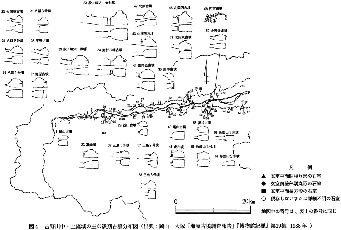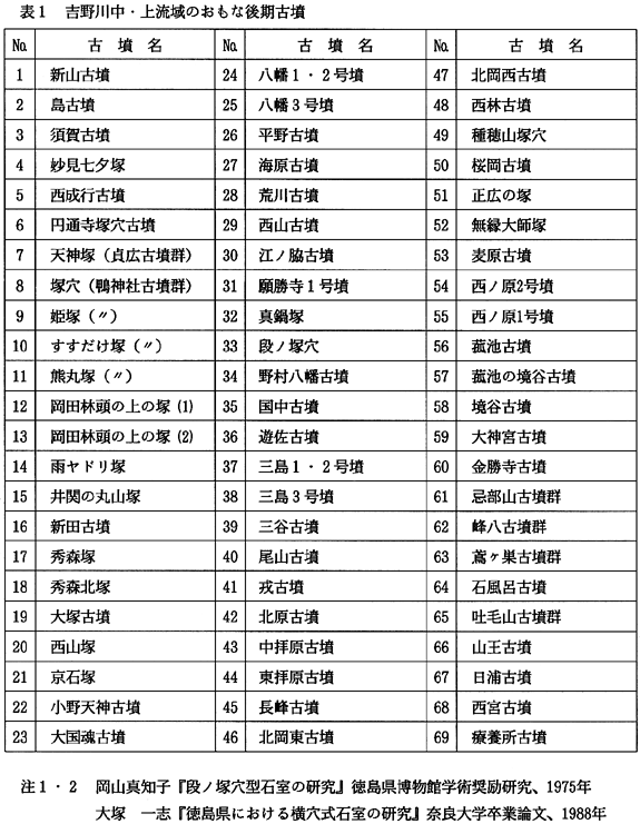 前後に位置する。 吉野川中・上流域の後期古墳の一覧表(表1)と分布図(図4)を作成したが、これを見ると、段ノ塚穴型石室・忌部山型石室と不明の三好郡グループがみられる。この分布の中で、須賀古墳は不明の三好郡グループに属していた。従来は段ノ塚穴型石室は、東は阿波町・鴨島町から美馬郡にかけて分布すると考えられてきた注2が、今回の調査成果により、少なくとも井川町まで段ノ塚穴型石室のタイプが広がっていることが指摘できる。また、立地等により、忌部山型石室とも共通性がみられるなど、段ノ塚穴型石室と忌部山型石室の関連性も強まったと言える。