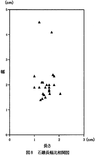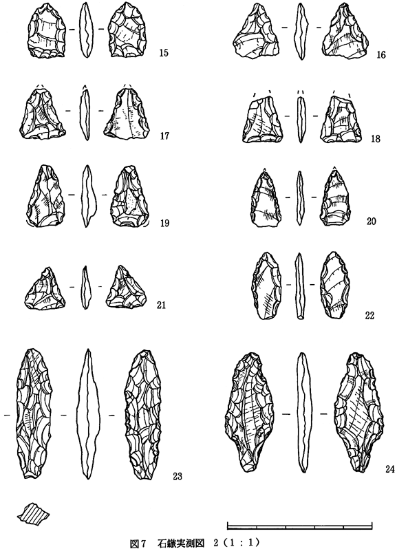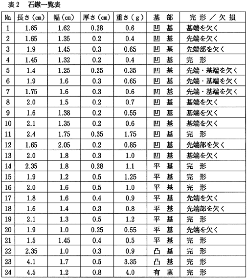 を測り、24点の中では傑出した数値を示している。この2点を除く22点は欠損部を復元しても長さ1.4〜2.4cm(平均長1.9cm)、幅1.0〜2.05cm(平均幅1.4cm)に収まる小型の石鏃である(表2)。