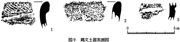 以上、石鏃について触れたが、石鏃の採集数以上にサヌカイトの剥片類が採集されていることも付記しておく。 (2)縄文土器 破片3点が採集されている(図9)。1は、深鉢の口縁部の破片であり、外反する口縁端部を外側に肥厚させ、その外面に横位のRL縄文を施した縁帯文土器である。縁帯文は幅10〜15mm