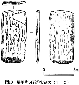 (3)扁平(へんぺい)片刃石斧(せきふ) 扁平片刃石斧(図10)は、弥生時代前・中期に普及した代表的な磨製石器で、柱状片刃石斧などとともに、伐採後の木材を二次的に加工する斧おのである。
