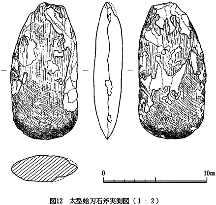 である。泥岩質の石材を用いており、表面の剥落や刃つぶれが著しい。平面形は、側縁のラインが主軸に対して左右非対称である。また、側面観は比較的薄手で、基端部もほとんど面を構成しない。典型的な太型蛤刃石斧に比べてやや扁平な形態の蛤刃石斧である。 本資料については、まずその採集地の地理的環境に注目すべきであろう。太型蛤刃石斧は木材の伐採道具とはいえ、木材供給地である山林から単独で出土することはまれで、集落跡の発掘調査で出土するのが一般的である。このことは、山林部での発掘調査例が少ないことにも起因しているが、本資料の採集地は、本来太型蛤刃石斧が使用されたと考えられる場所(環境)であり、木材の生産活動の一端を反映する貴重な事例である。今後、当該地周辺で土器なども含め、採集例が増加する可能性もあり、期待される。