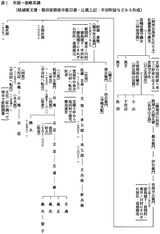 酒造業を中心に大きな経済力を有した布屋一族は、本拠の徳島市中から昼間村へ進出し東井ノ川村、半田村あるいは足代村にその足跡を残した。とりわけ井川町は、布屋治右衛門が長楽寺に寄進した町唯一の国重要文化財の楊柳観音画像や、布屋の渡しの名称によりその行跡はひときわ大きい。 しかし、井川町(東井ノ川村)、三好町(昼間村・足代村)において、布屋一族のまとまった研究はなされていない。これは、史料が乏しいことに起因するのであろう。 昭和57年刊『井川町誌』、平成9年刊『三好町史』歴史編に収載されている棟付帳などによって、徳島市中の通町に本拠があったことが判明するが、徳島城下に居住するまでの経緯は未載である。この経緯は『稲田家御家中筋目書』とその原史料になったと思われる結城家文書に記録されている。 布屋に関しては、昭和56年刊『半田町誌』下巻が独立した項目を設けて記述している。これは、半田町に現住する直系子孫の結城家に伝わる古文書を活用したためだが、根拠となる諸史料は部分的な掲載にとどまっている。そのため、今回結城家文書のうち根幹をなす史料を全文収録し、布屋一族の略系譜(表1)を加えた。