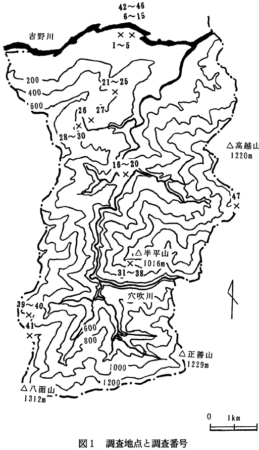 2.調査地概観 穴吹町は徳島県の北西部に位置し、東は山川町・美郷村、南は木屋平村・一宇村、西は貞光町、北は吉野川を挟んで脇町と接している。吉野川の支流である穴吹川が、町の中央を南北に流れており、その両岸の狭い平野と北部の吉野川の沖積平野を除いては、ほとんどが山地である。町内には、東部に奥野々山(1159m)、中部に半平山(1015.9m)、南部に綱付山(1255.8m)・八面山(1312.3m)、西部に友内山(1073.1m)、と1000m