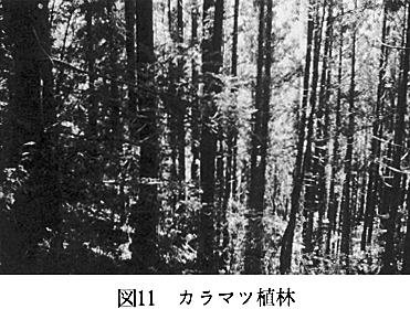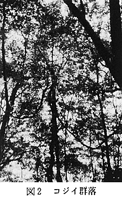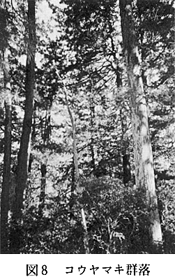 7)コウヤマキ群落 穴吹町の南部、平谷の石尾神社にコウヤマキ林が見られる。社殿後の大きな岩塊の上に成立しており、周囲の植林などから孤立している。社叢として保護されてきたものと思われ、規模といい、純林に近い高木層の組成といい、見事なものである(図8)。 コウヤマキ林は、当地のように岩塊上などの水分条件の極めて悪い立地に成立するが、県内では社叢として残されているものの外は、多くは伐採されて失われてしまっている。 したがってこのコウヤマキ林は、非常に貴重である。調査数1なので、種構成を記録するのみにする。 調査年月日:平成10年12月20日。調査場所:穴吹町平谷石尾神社。標高:670m、地形:斜面中、方位:N60°E、傾斜:35度、調査面積:500平方メートル。 高木層 高さ:20m、植被率:70%、胸高直径:70cm。コウヤマキ4・3、ヒノキ1・1、フジ+。 亜高木層 高さ:10m、植被率:15%。 ソヨゴ1・1、ネジキ1・1、フジ+。 低木層 高さ:5m、植被率:5%。 アセビ1・1、ウスノキ+、ヤマウルシ+、スノキ+、ネジキ+、テイカカズラ+、シャクナゲ+、フジ+。 草本層 高さ:0.5m、植被率:3%。 コウヤマキ2・+、ヤマウルシ+、ウスノキ+、ソヨゴ+、アセビ+、ヒノキ+、ネジキ+、スギ+、タラノキ+、スノキ+、シャクナゲ+。