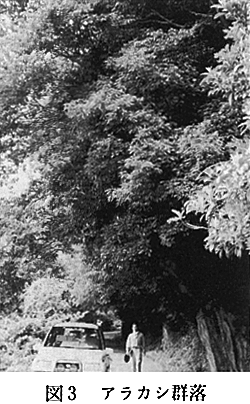 2)アラカシ群落 群落識別種:アラカシ、シュロ、ハカタシダ。調査区数5。平均出現種数27種。 アラカシも照葉樹林の代表的な高木である。この群落が成立する立地も人間の撹(かく)乱を受けやすく、残されているのは、あまり利用されない急傾斜地や社寺林に限られている。 穴吹町でも、穴吹川やその支流の岸などの急傾斜地にアラカシ群落が見られた。高木層、亜高木層にアラカシが優占し、その中にコナラ、ケヤキなどが混生する。低木層には、イヌビワ、ネズミモチ、カナメモチ、ヤブツバキなどが見られ、草本層にはシュロ、マメヅタ、ハカタシダなどが見られた。しかし、面積は狭く、道路に接していて状態は良くない(図3)。また、人里に近いため、ヤマガキ、ビワ、チャノキなども混生していた(表4)。 コジイ群落と種組成を比較すると、マメヅタ、カナメモチ、イヌビワなどの共通種が多く見られる。したがってこの群落は、急傾斜地のため、厚い土壌が形成されずコジイ群落に変われなかった土地的極相と考えられるが、人家に近いため薪(しん)炭林として利用された二次林的要素の強い森林である可能性も考えられる。