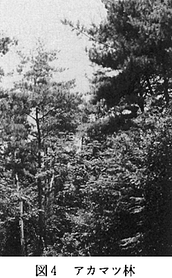 3)アカマツ群落 群落識別種:アカマツ、モチツツジ、ワラビ、ネズ。調査区数5。平均出現種数34種。 穴吹町では、三頭山(641.2m)や、高丸(740.9m)の上部などにアカマツ群落が見られる。現在みられる大部分のアカマツ群落は、人間が自然の植生を破壊したあとに成立し、その後も伐採や下刈りなどの管理によって持続された代償植生である。陽樹であるアカマツは日当たりの良い地面で発芽し、成長も早い。アカマツの幼木は暗い林床では成長できないため、陰樹林へと移り変わるが、薪炭林として利用される場合は、人為的な伐採や下刈りにより陽樹林が維持される。このような森林を二次林とよぶ。しかし、燃料が薪炭から石油やガスに変わった現在では、人々は山に入らなくなり、いわゆる「松枯れ現象」の影響もあり、アカマツ群落は減少している。 調査したアカマツ群落では、高木層はアカマツが優占し、亜高木層にはヤマウルシ、ヤマザクラ、コシアブラ、ネムノキなどが見られ、低木層はヒサカキ、トサノミツバツツジ、モチツツジが優占していた(図4)。また草本層にはワラビ、イヌツゲなどが見られる。高木層と低木層の植被率が高く、平均種数も34種と多かった(表5)。
