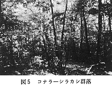 でコナラ−ミズナラ群落が見られている。 今回の調査では、コナラ−シラカシ群落ではシラカシ、ヒサカキ、アオキなどの照葉樹林構成種が、後述のシロモジ群落ではヨグソミネバリ、イタヤカエデ、コハウチワカエデなどの夏緑樹林構成種が見られた。コナラ−シラカシ群落とシロモジ群落の境界は、標高800m
