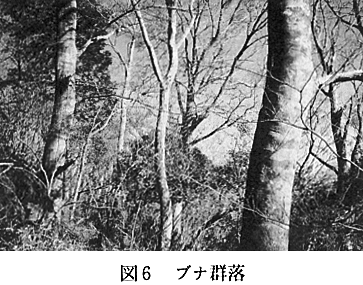 付近によく発達している。しかし、県内のブナ林は、林道の整備などによって次々伐採されており、自然林として残されているものは大変貴重なものとなっている。県西部では半田町でブナ林が報告されている(西浦ほか、1992)。 穴吹町では、山川町との境の奥野々山の山頂に小面積ではあるが、ブナ林が残されている(図6)。奥野々山神社の社叢として残っているものであるが、当地の夏緑樹林の種組成を知る上で、非常に貴重な森林である。調査数1なので、種構成を記録しておくのみとする。 調査年月日:平成10年12月13日。調査場所:穴吹町奥野々山神社前。標高:1150m、地形:斜面上、方位:S20°E、傾斜:25度、調査面積:432平方メートル。 高木層 高さ:18m、植被率:50%、胸高直径:78.5cm。 ブナ3・3、イヌシデ1・1、ヨグソミネバリ1・1、ミズナラ+、リョウブ+、ヤドリギ+。 亜高木層 高さ:8m、植被率:30%。 ブナ1・1、リョウブ1・1、ヤマウルシ1・1、イタヤカエデ+・2、ヒノキ+、ウリハダカエデ+、アオハダ+。 低木層 高さ:5m、植被率:70%。 シロモジ4・3、アセビ2・2、コハウチワカエデ1・1、ウリハダカエデ1・1、ミツバツツジ