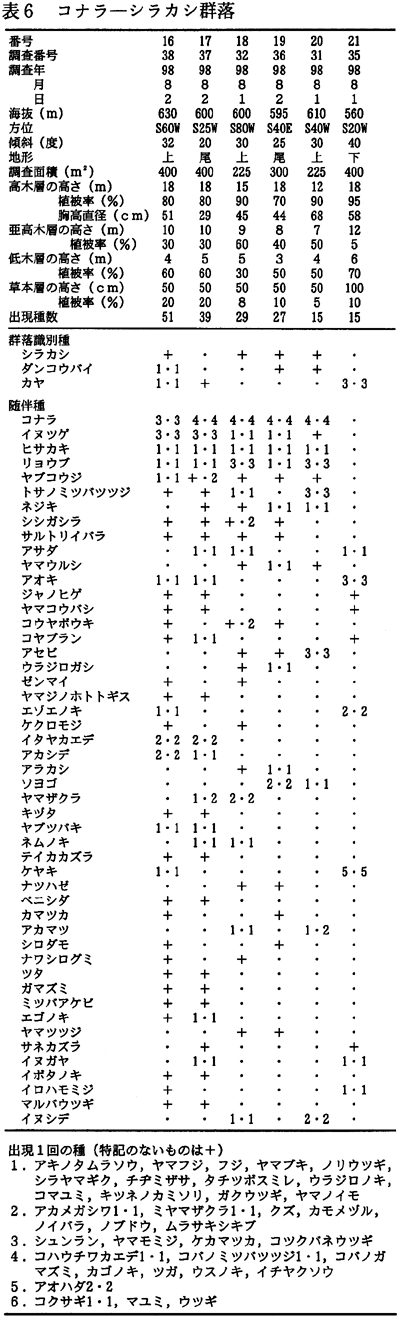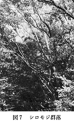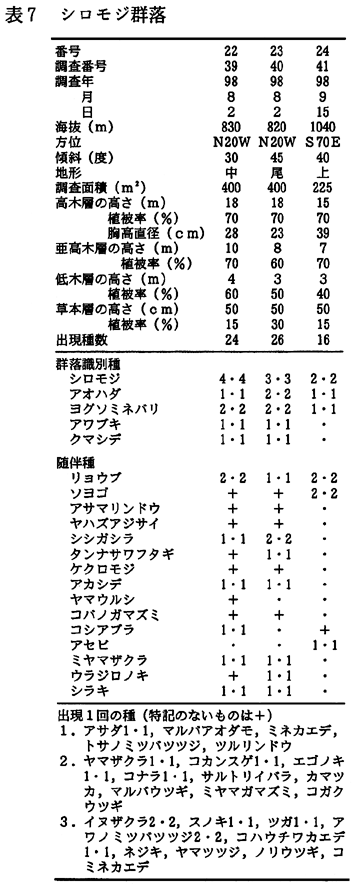 6)シロモジ群落 群落識別種:シロモジ、アワブキ、クマシデ、ヨグソミネバリ、アオハダ。調査区数4。平均出現種数21種。 高木層にヨグソミネバリやアオハダ、リョウブが優占し、低木層はシロモジが優占している。シロモジ、シラキ、コハウチワカエデ、アオハダ、タンナサワフタギなど、ブナ群落の要素が含まれている(図7、表7)。
