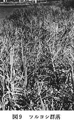 9)ツルヨシ群落 群落識別種:ツルヨシ、オオイヌタデ。調査区数5。平均出現種数2種。 ツルヨシ群落は洪水のたびに冠水する川や谷に分布する自然植生である。ツルヨシは、川の流れに強く、長い匍匐(ほふく)茎を出して繁殖し、湿性な水際でもよく生育する。川が増水すると川下側に倒れるが、増水がおさまると、速やかに再生する。河川の中流部に発達するマルバヤナギ群落に比べ、ツルヨシ群落は上流部にも見られる。穴吹町では、ツルヨシ群落は吉野川河原の水際と、主に穴吹川とその支流でみられる。 群落内では、ツルヨシが植被率90〜100%で優占し、わずかにオオイヌタデ、ヨモギ、ミゾソバなどが見られる(図9)。平均出現種数も2種、と少ない(表9)。