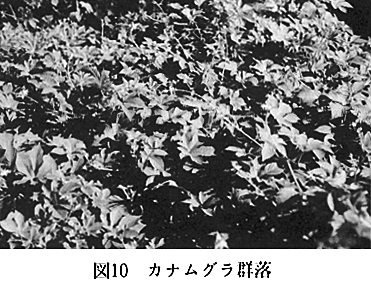 11)カナムグラ群落 群落識別種:カナムグラ、ガガイモ。調査区数5。平均出現種数6種。 吉野川の河原に発達したマント群落である。河原のように砂質の土壌ではなく、泥質の富栄養の土壌の上に発達する。密集したカナムグラが一面に地面を覆い(図10)、地表面での光量を不足させるため、他の植物の侵入が防がれる(表10)。