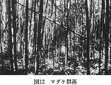 13)マダケ群落 群落識別種:マダケ、ハチク、ヤマアイ、ヤブラン、イタドリ、ムクノキ、クサマオ、アオイスミレ。調査区数5。平均出現種数28種。 吉野川の河原と耕作地の間に帯状に竹林が見られる。これは、洪水の際、水の勢いを弱めるために人為的に作られ、維持されてきた竹林である。最近は堤防が築かれたが、堤防の内側と外側に、相当面積残されている。また、人家の周りにも面積は少ないが竹林が見られる。 高木層はマダケが優占し、ハチク、ムクノキ、エノキが混生する(図12)。低木層の植被率は低いが、トウネズミモチ、イヌビワ、ヤブニッケイなどがまばらに生えている。一方草本層の植被率は高く、全調査地点でヤマアイが優占し、アオイスミレ、ホウチャクソウ、カテンソウなど多くの種が見られた(表12)。