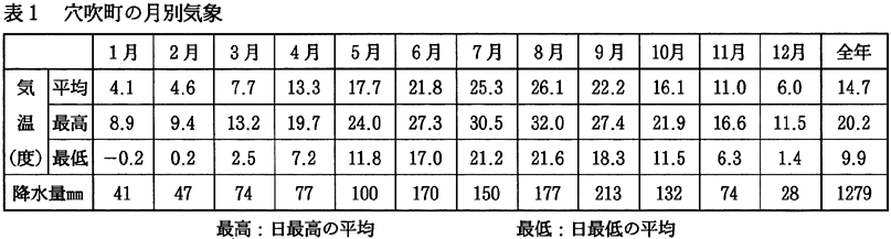 である。徳島県内では、気温が低く、降水量が少ない地域となっている。 日本の森林帯の水平・垂直分布と気温の関係を示す指数として、吉良の「暖かさの指数」がある。これは月平均気温が5度以上の月を選び、それぞれの値から5を引いた数値の総和を求めたものである。穴吹町の気象資料から「暖かさの指数」を計算すると測定地点では117.2となることから、穴吹町の低標高地域は照葉樹林帯(「暖かさの指数」85〜180)に属すると考えられる。また海抜高による気温減率を100m