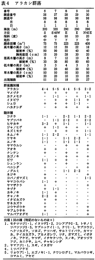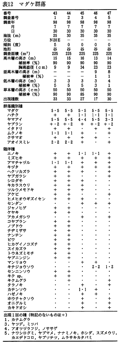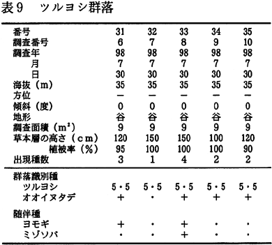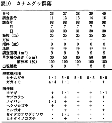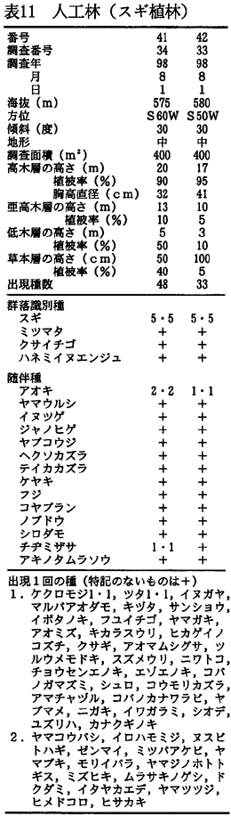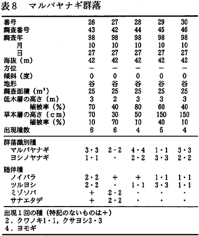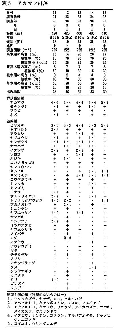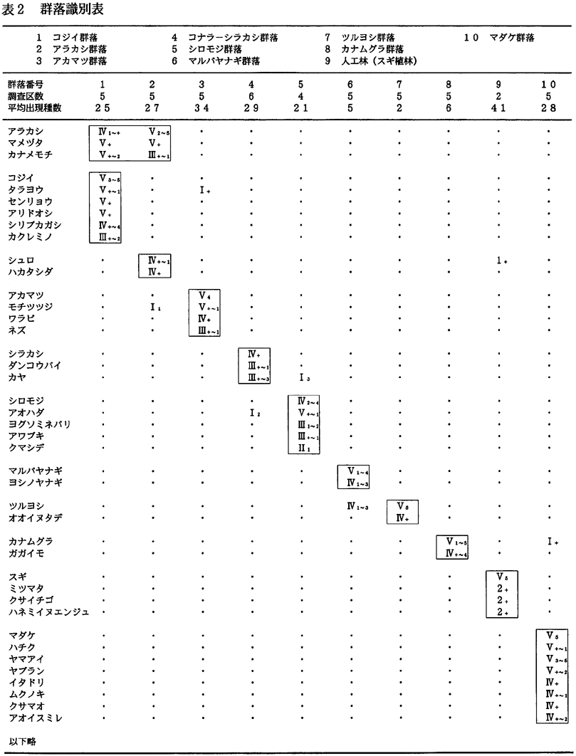 を標準にした。このようにして得られた49の植生調査資料から、各群落の識別種群を引き出して、群落識別表(表2)及び各群落表(表3〜12)を作成した。 これらの結果から
