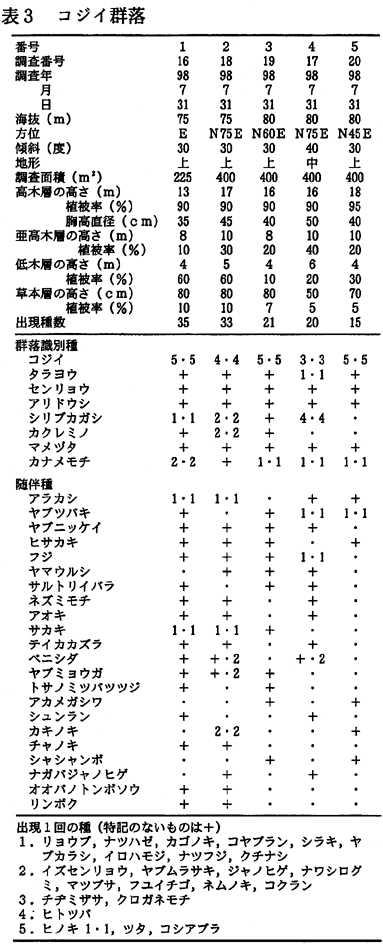 前後のコジイが優占し、その中にシリブカガシ、タラヨウ、カクレミノなどが混生している。低木層には、サカキ、カナメモチ、ヤブツバキが、草本層にはセンリョウ、アリドオシなどが見られる(表3)。 この群落は自然度も高く、面積も社叢(そう)としては広いため、本町の潜在植生を推測する上で非常に大切な群落である。今後伐採されることのないように保護されるべきである。