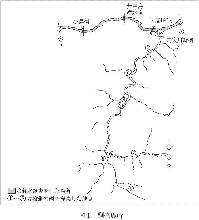 2.調査の結果 吉野川に生息する淡水魚は自然生息のものが多い。調査は、吉野川本流では、穴吹町区域のすべての場所で潜水調査し、肉眼で生息する魚種を確認して、水中ノートに記録した。穴吹川では調査地点を8カ所設定し、投網で採集した。調査場所を図1で示す。