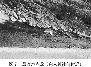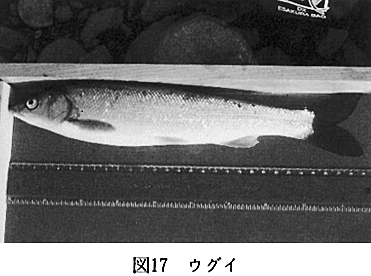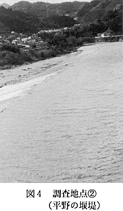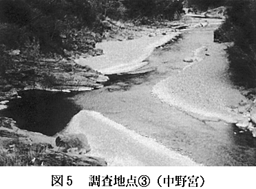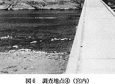 ほどである。投網で採集できたのは、アユ、ウグイ、オオヨシノボリの3種である。いずれも個体数は少ない。淵(ふち)では、ウグイが2〜3匹群れになっているのが、観察できた。 調査地点4(図6)は、水質は良質で流れがあり、平瀬になっている。潜水橋付近を投網を使って採集したが、魚の個体数は少なく、オオヨシノボリの小型のものを2個体採集した。岸辺の岩が出ている所を水中観察すると、オイカワ、アユ、シマドジョウの生息を確認できた。川の中央部で水深は30cm