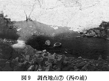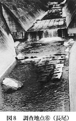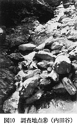 調査地点7(図9)は浸食が深くなってきている場所であり、左岸は岩盤よりなっている。底質は、石と礫である。水質は良く、流れが速い。投網で採集できた魚は、7種あり、個体数も多い。今回は採集できなかったが、聞き取りによるとアカザも生息している。 調査地点8(図10)は穴吹川の支流の内田谷である。大きな岩がゴロゴロしていて、上流部の景観を示している。水質は良く、流れがあるが、流れの無いたまり場で投網を打つと、2個体のアマゴが採集できた。その他の魚種はまったくいなかった。