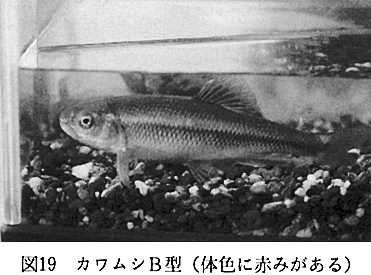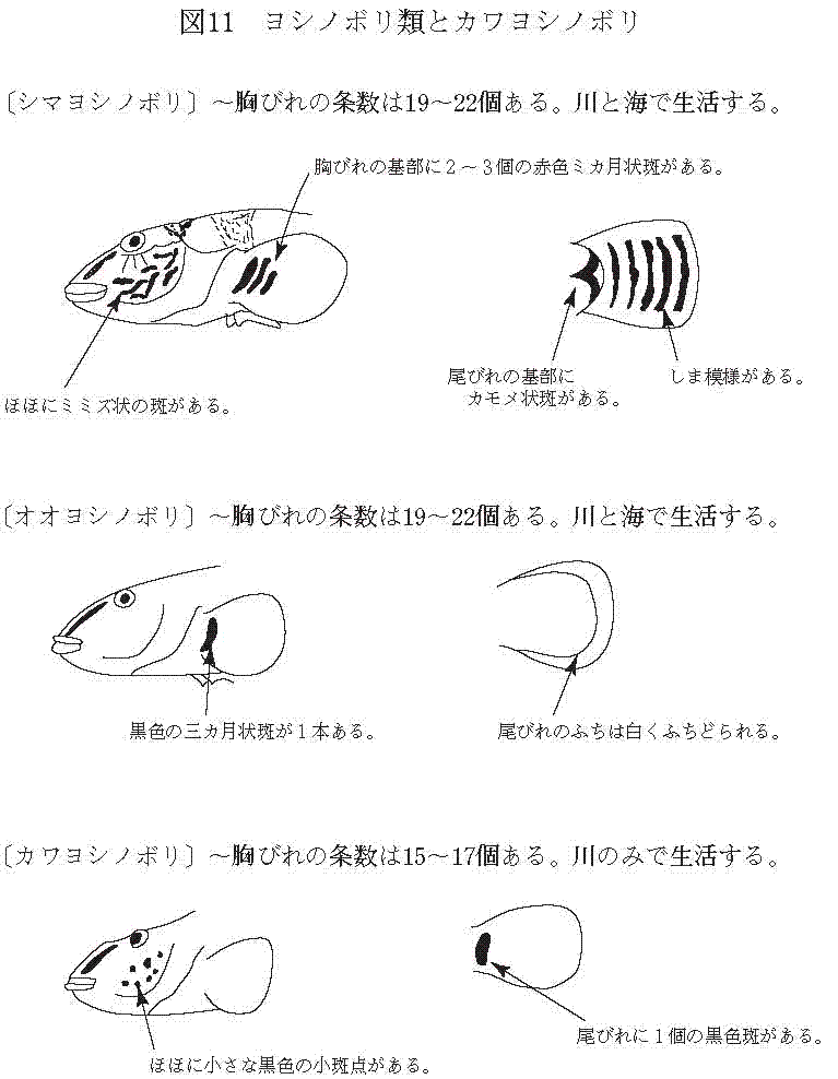 japonicus 〔注〕 ヨシノボリ類は日本に5種いるが、そのうちシマヨシノボリとオオヨシノボリの2種の生息を確認できた。ヨシノボリ類は、ふつう川でふ化したものはただちに海へ流れる。海に流下したものは、数カ月間の浮遊生活を送った後、体長2m程度に育って、7〜10月に川へ上って来る。川へそ上するのは、水温に左右される。小さなヨシノボリの稚魚が、夏になると群れとなって、海から川の上流の方へ向かって泳いでいるのがよく観察できる。しかし、中には海へ下らなくて、一生川で過ごすものもいる。 カワヨシノボリは、河川で一生を過ごす。みそ汁に入れて食べるとすごくおいしい。ヨシノボリ類とカワヨシノボリの違いは、胸びれの筋の数が19〜22本あるのがヨシノボリ類で、カワヨシノボリの胸びれの筋の数は15〜17本しかない。違いを図11に示す。