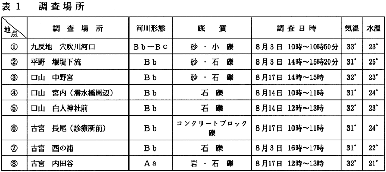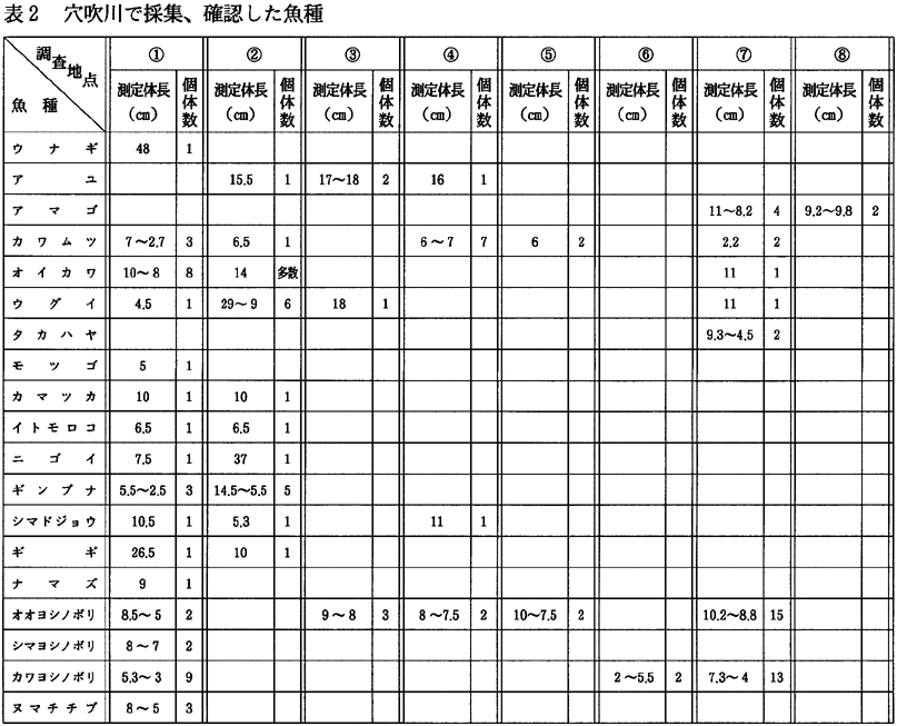 2)穴吹川の淡水魚(穴吹町域のみ) 穴吹川に調査地点を8カ所設定して、調査をした(表1)。調査方法は投網を使用した。また潜水調査をし、水中で観察した。調査結果を表1に示す。穴吹川の水質はきわめて良く、四国一の清流といわれている。採集したり、水中で観察できた淡水魚は19種であり(表2)、聞き取り調査では、さらに6種が確認できたので、合計25種が生息していることになる。ボウズハゼは上流にいるとの事で、場所は特定できなかった。