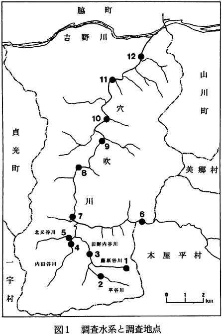 2.調査地点と調査方法 調査は、図1に示すように、穴吹川本流とその支流の藤原谷川、平谷川、内田谷川、北又谷川に合計12の調査地点を設定し、各地点で採集を行った。調査地点としては、汚水の流入などがない、川底が比較的安定している場所で、早瀬を含む流れを選び設定した。